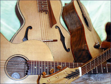 The necks of my guitars are made largely from Mahogany, Sycamore, Maple, or Walnut, but nearly any wood could be used. Necks are laminated from three to five or more pieces to add strength and stiffness. Double acting truss rods are installed with the access nut at the head. Fret boards are of Coca bola, Rosewood or Ebony, with a standard width of 1.75" at the nut.