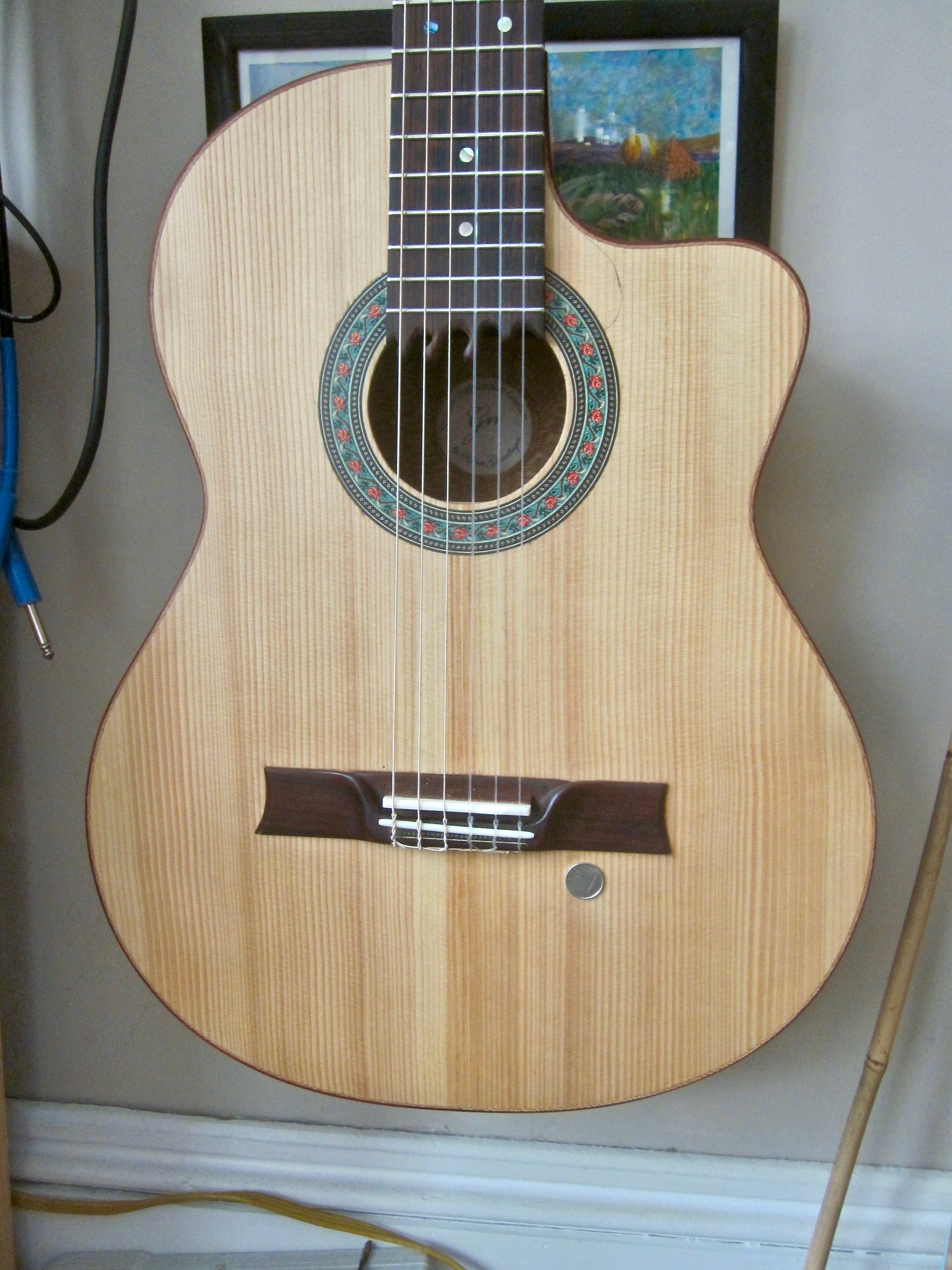 I hand build the lining from three or more thin strips of tone wood and then carve away all but what is needed to land the top or back onto the sides of the instrument. This is far more time consuming, but provides a far stronger and stiffer body along with reducing weight and minimizing the clutter inside the body. I believe that this adds to the total quality of the sound that all of my guitars put out. This also allows me to add some decorative stripes inside the instrument that is rarely noticed, but adds a subtle touch that the owner knows is there.