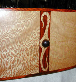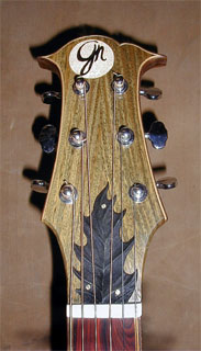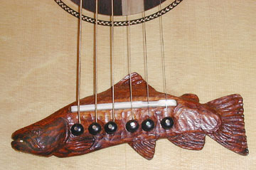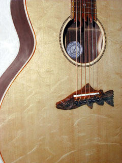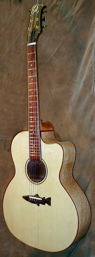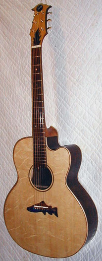 The Palouse Jumbo is not fashioned after any standard. It is a composite of several older designs and thoughts of my own. It is 42" in total length with a body length of 20". It has an upper bout of 16", lower bout 11" and is 4" deep at the neck and 4.5" at the tail. The cutaway provides easy access to the upper register and when combined with the careful thinning around the outer edges of the top plate it retains a wonderfully big, full, clear bass. The top is also left a bit thicker under the bridge and the braces are tuned to provide just enough stiffness for the treble to ring out clear focussed and well articulated. Appointments can vary